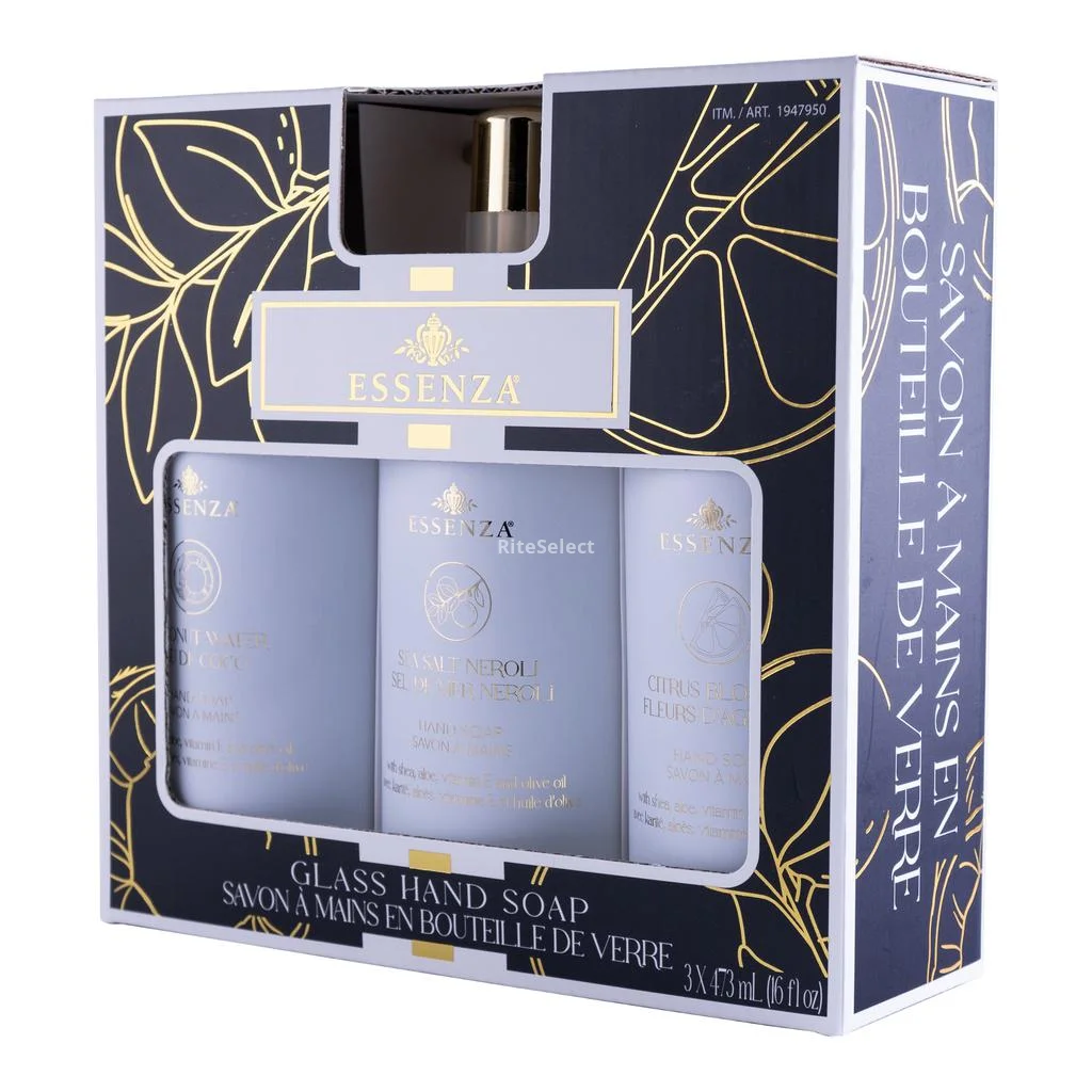 Experience gentle, nourishing cleansing with Essenza Hand Soap. This set includes 3 unique fragrances: Citrus Blossom, Neroli Sea Salt, and Coconut Water. Each soap is formulated with shea butter, aloe vera, olive oil, vitamin E, and essential oils that moisturize and protect your hands while enveloping them in a delicate scent.